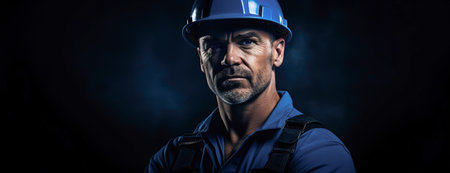 Panoramic banner headshot of Electrician professional over dark background with copy space
