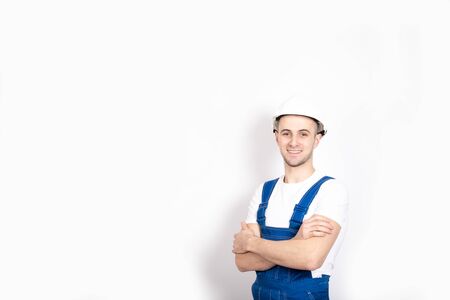 A handsome young guy is smiling. Builder in blue overalls and a white helmet. Against the background of a white wall. Place for text