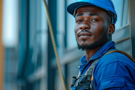 Confident young construction worker in safety gear poses against a striking blue background