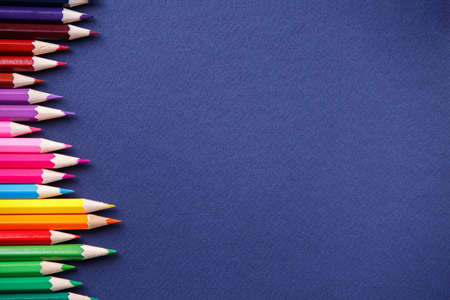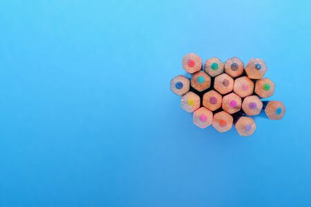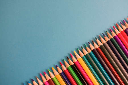 Colorful Pattern of Pastel colored pencils on blue background and copy space