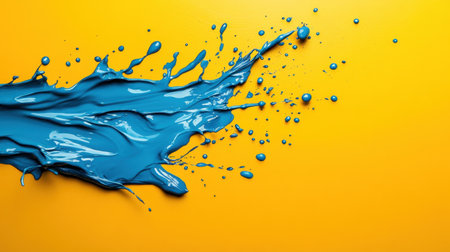 A vibrant blue paint splash creates a striking visual impact against a bright yellow background, highlighting fluidity and creativity. Perfect for artistic projects.