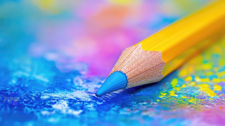 A vibrant close-up of a yellow colored pencil resting on a colorful abstract background featuring blues, purples, and playful splashes of color.