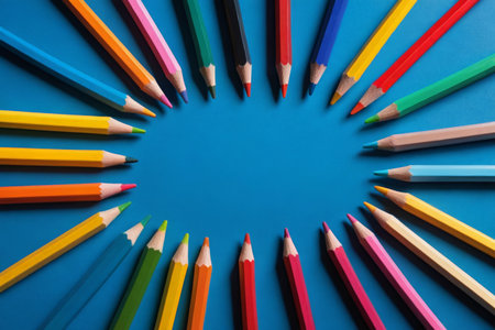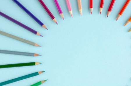 Colored pencils arranged on a blue background
