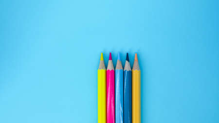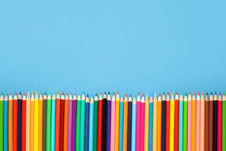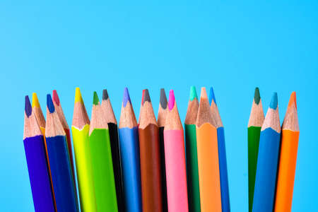 An image of set of color pencils on blue background with copy space