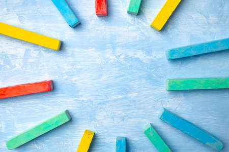 Colorful chalks on blue background with copy space for text