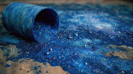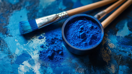Vibrant blue pigments and paintbrushes arranged on a textured surface showcasing artistry in progress