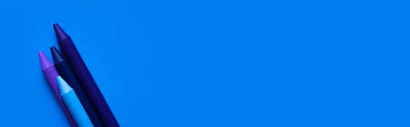 top view of blue gradient crayons on bright background, banner