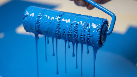 showing close up of a paint roller dripping bright blue paint onto a surface. resolution