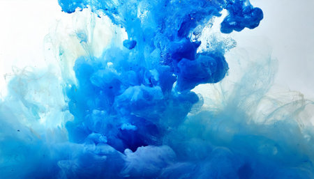 Close-up view of vibrant blue ink swirling and blooming in water, creating dynamic, organic abstract shapes and ethereal patterns with light and...