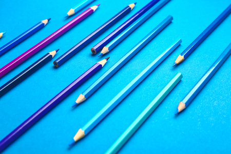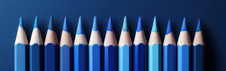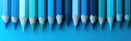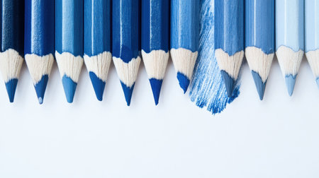 A creative composition displays a range of blue colored pencils arranged neatly. The smooth gradient effect showcases various shades from light to dark, ideal for artistic inspiration.