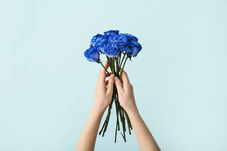 Hands with beautiful blue roses on color background