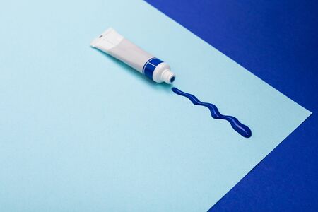 Tubes of paints on blue paper background. Frame made of tubes with multicolored paints. Flat lay, copy space