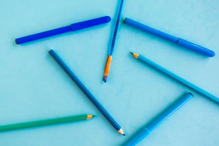 Color pencils on blue background. top view.