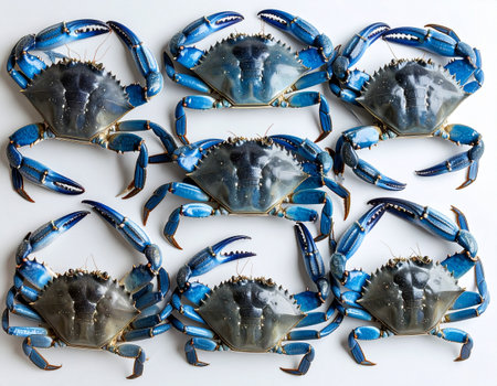 AI generated top view of fresh whole blue crabs with vibrant shells and sharp claws arranged neatly showcasing premium seafood against clean white background