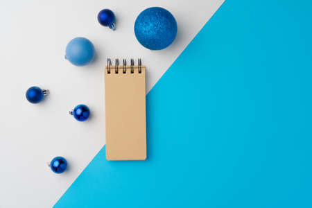 Blue Christmas balls on blue background on left and right side. Flat lay top view with copy space. Holidays concept.