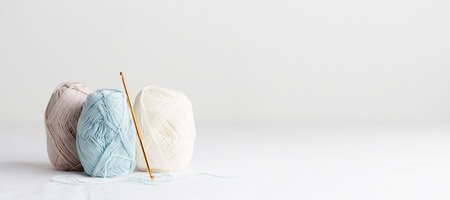 needlework. Crochet hook and balls of cotton yarn pastel colors on a white table, copy space
