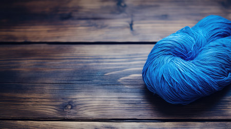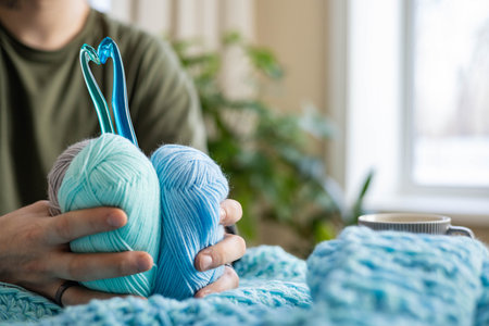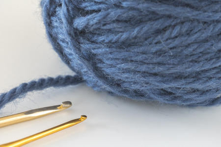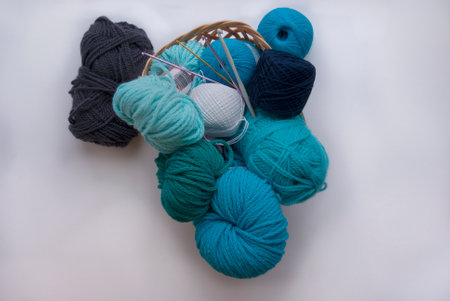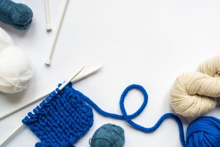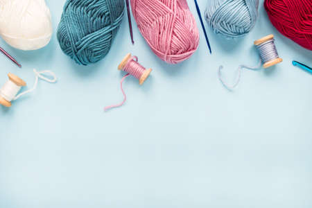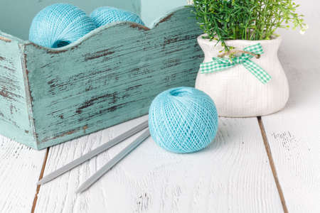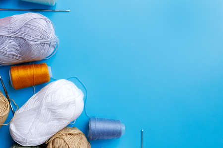 Babins with blue and blue yarn for making handmade knitted bags. Selective soft focus. Free space for text.