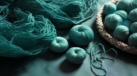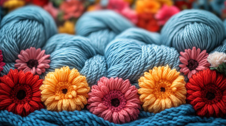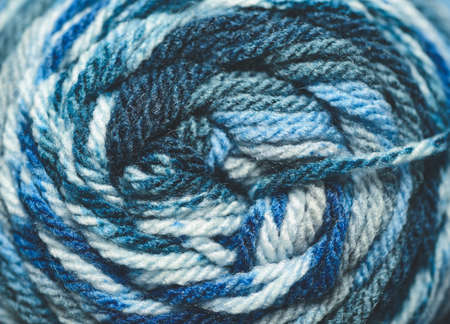 Soft yarn balls in various shades of blue and beige create visually appealing texture. intricate patterns and colors evoke sense of warmth and creativity, perfect for crafting projects