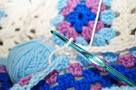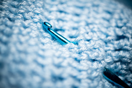 An extreme close-up shot with selective focus of a piece of deep blue crochet fabric with blue crochet hook needle.