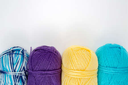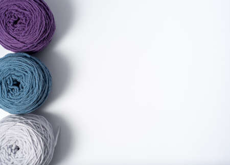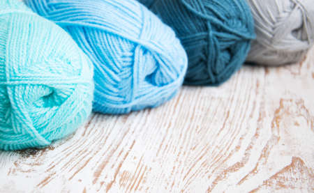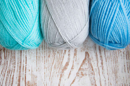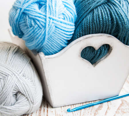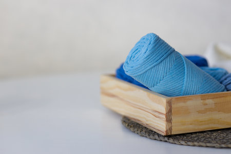 Part of a wooden box with balls of ropes in blue and cyan colors on a white table with space