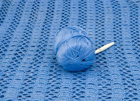 A few blue balls of cotton yarn next to a knitted fabric a knitting hook