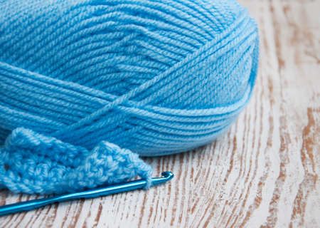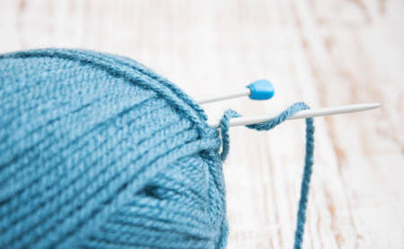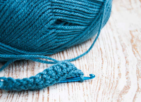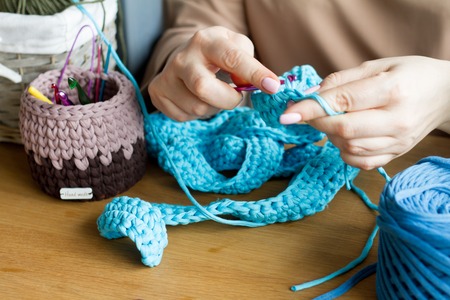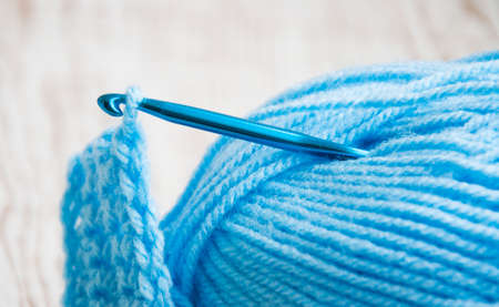 Hands of a young woman knit crochet from blue yarn on a light wooden surface. Start a new bag of yarn. Selective soft focus.