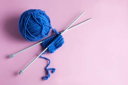Blue knitted wool on a pink background with knitting needles, hobby. Overview