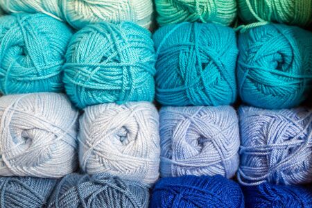 Colored balls and skiens of yarn. Top view. Aquamarine colors. Yarn for knitting.