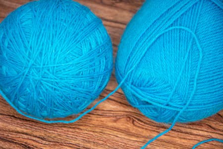 Skein of blue threads for knitting on a wooden background. pompon. fluffy soft pompon made of yarn.