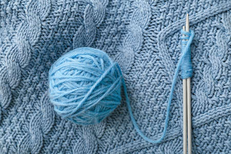 Close up of knitted wool fabric texture in soft blue color. Concept of cozy textile, warm clothing, soft yarn, handcraft. Fabric, knitting, texture for design element.