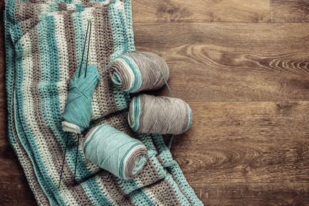 Home hobby. Skeins of woolen threads, yarn, knitted product on the floor. Top view