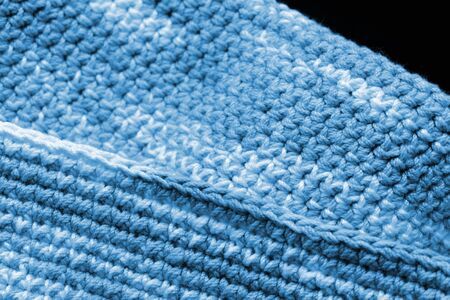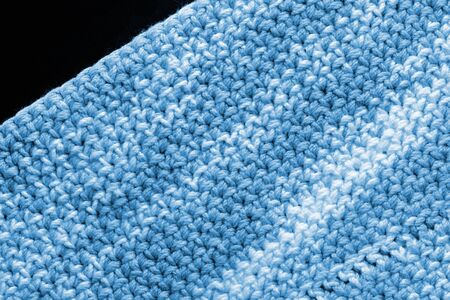 Crocheted fragment of melange yarn close-up. Handmade concept. Abstract background blue color toned