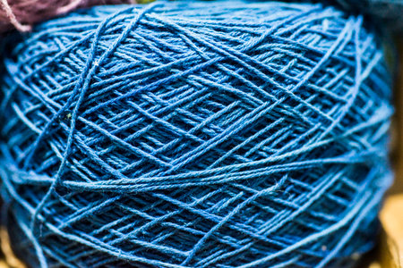 Woolen yarn ball, skein of tangled blue sewing threads, selective focus