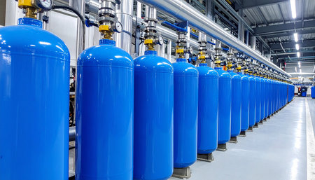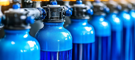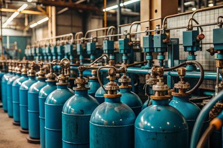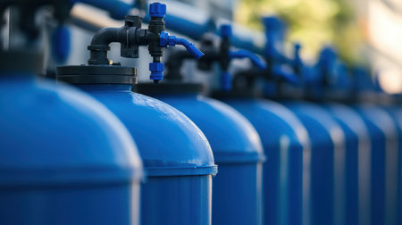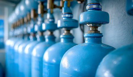 A detailed close-up view of a series of blue gas cylinders equipped with valves, showcasing their design and functionality within a modern industrial environment.