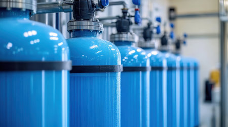 Several blue filtration tanks line the interior of a water treatment facility. These tanks are crucial for purifying water and ensuring quality