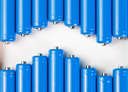 Close up view of numerous cylindrical batteries with blue bodies and shiny silver tops, arranged in parallel rows. Represents energy, power, and modern technology.