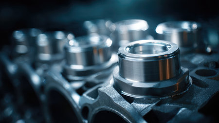 This close-up image captures the intricate details of precision engine components made from shiny metal. The industrial setting emphasizes craftsmanship and technology in automotive design.