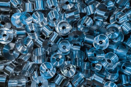 An industrial background with a pile of shiny metal cnc aerospace parts. Close-up full frame flat lay tech backdrop.
