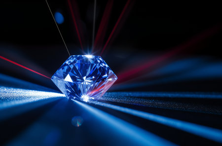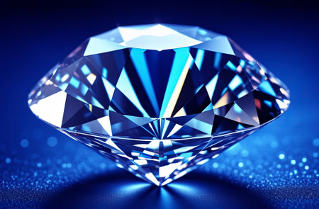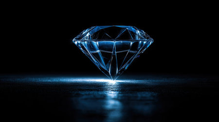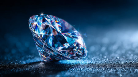Large, sparkling diamond resting on a dark blue reflective surface, creating a luxurious and elegant atmosphere with a beautiful bokeh effect in the background