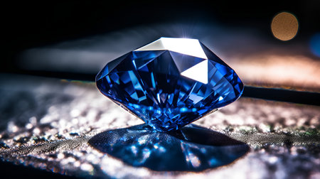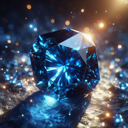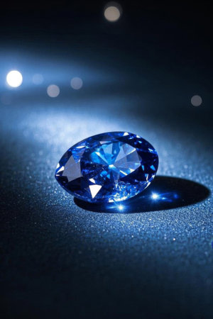 A brilliant blue gemstone rests on a reflective surface, capturing light against a soft, blurred background filled with warm bokeh highlights, creating a captivating and elegant atmosphere.