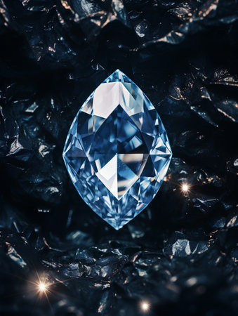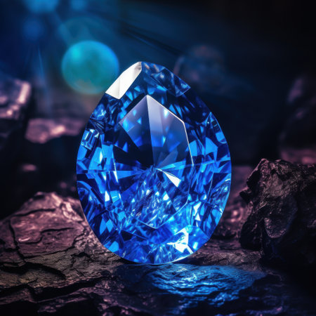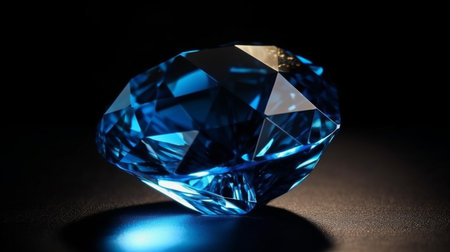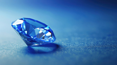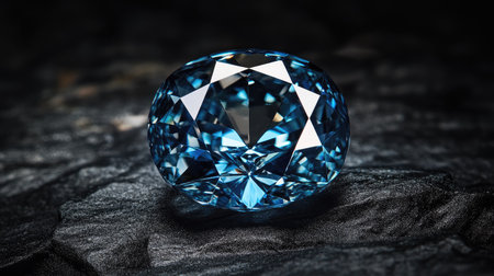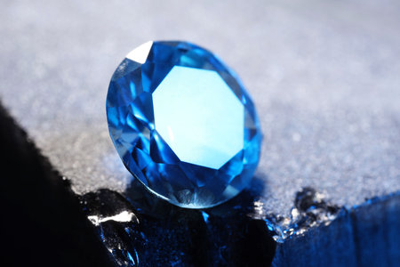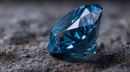A captivating close-up of a blue gemstone, showcasing its intricate facets and brilliant shine on a dark textured surface, perfect for luxury and jewelry themes.