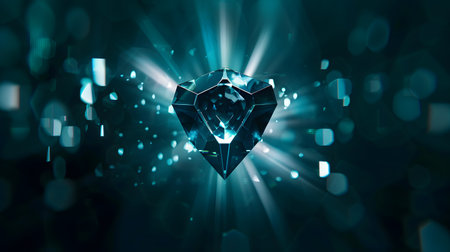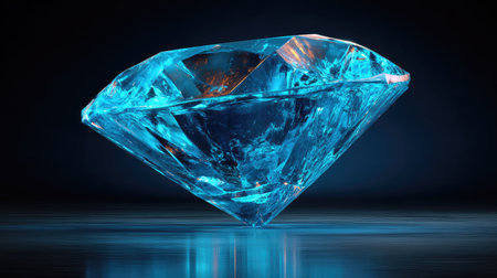 This image showcases a radiant blue gemstone against a deep, dark backdrop. The composition highlights the gem's multifaceted structure, emphasizing its reflective qualities and internal illumination. The artwork is characterized by dynamic lighting, creating high contrast and adding to the gem's allure. This visual could be useful for various commercial applications.