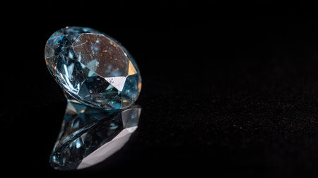 Shiny blue gemstone with multiple facets on reflective dark surface