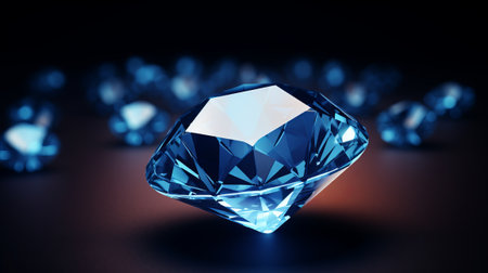 A close-up view displays a radiant blue diamond against a dim, textured backdrop. The gem's multi-faceted surface reflects light creating bright highlights. The composition utilizes a low-angle perspective, emphasizing the diamond's shape. This image is suitable for commercial applications related to luxury, design, or visual media.