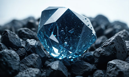 A stunning blue diamond is elegantly sitting atop a rough rock, catching the light beautifully in its facets and radiating charm