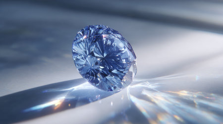 A single sapphire diamond rests on a blue surface, catching the light and reflecting a dazzling array of colors. The background is a soft blue gradient, creating a sense of depth and wonder.