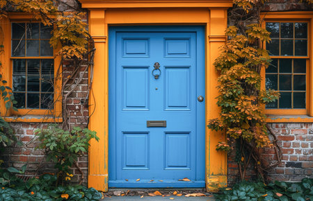 A vibrant yellow house entrance featuring a blue door, surrounded by lush green plants. This inviting facade showcases charming architectural details ideal for home decoration.