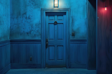 Dimly lit, enigmatic blue door set in a moody blue wall, evoking a sense of mystery