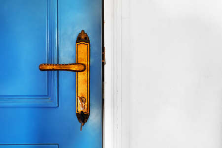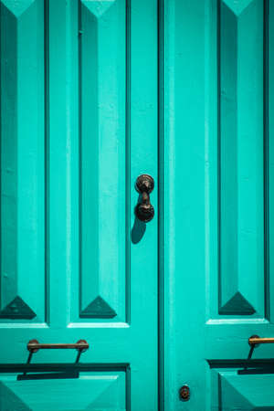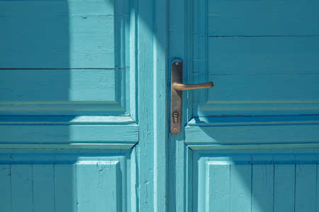 The wooden surface of turquoise color. Door handle made of brass on the wooden door made of boards. Light and shade on the material of wood.