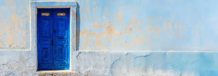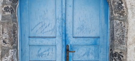 Blue wooden vintage closed door with arch on an empty whitewashed wall background. Cyclades Greek island architecture, blank copy space card template advertise.